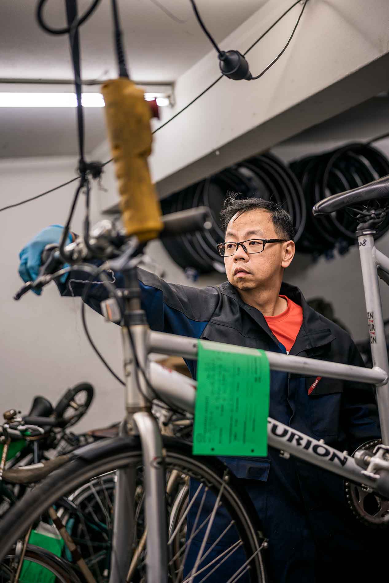 ”Jeg kommer her i værkstedet 2 gange om ugen, fordi det gør mig glad at reparere cykler. Jeg kan godt lide at arbejde med værktøjet. Det føles meget tilfredsstillende, når jeg har lavet en cykel færdig. Vi arbejder meget og snakker lidt undervejs. Nogle gange holder vi en kort kaffepause. Jeg lærte selv at cykle som barn, men cyklede aldrig som voksen i Myanmar, fordi trafikken er alt for farlig. Det synes jeg slet ikke, den er i Danmark.”