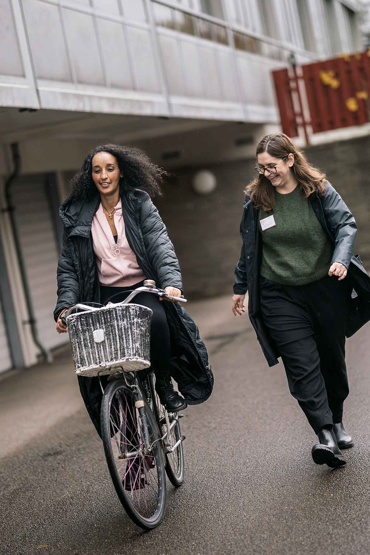 Mhret Kufulu Zaid er fra Eritrea og har været i Danmark i 3 år. Arbejder som afløser på et plejehjem. ”Jeg får god hjælp til sprog og kommunikation her i Netværkshuset, og nu lærer jeg også at cykle. Jeg har været til træning 2 gange. Jeg synes, det er nemt at cykle, og glæder mig til at kunne gøre det i stedet for at tage bussen. Min mand cykler, og mine børn skal lære det, når de er store nok. Vi har allerede købt en cykel til den ældste på 2 år.” Ralitsa Stanimirova (bagerst) kom selv til Danmark for 16 år siden – nu lærer hun andre kvinder at cykle og hjælper deres børn med matematik som frivillig i Netværkshuset.