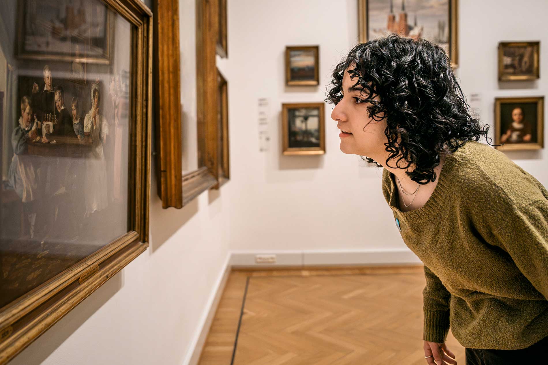 Laura, Kamma og Hediye fra kunstklubben LouisianaPigerne genkender flere af de klassiske motiver i de gyldne rammer på museets vægge. De har set dem før – både på museet og i skoleopgaver – men de får også øje på nye detaljer: Sydlandske udsigter og omgivelser viser, at mange af datidens kunstnere rejste ud i verden og fandt inspiration.
